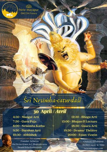 Venez vous immerger dans le kirtan, l'écoute et le service dévotionnel, et recevez les bénédictions du Seigneur Nrsimhadeva.